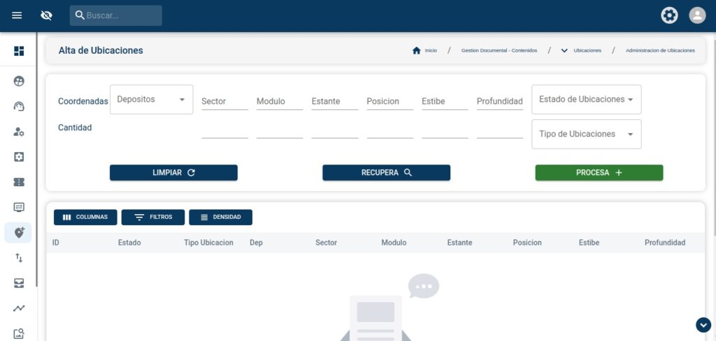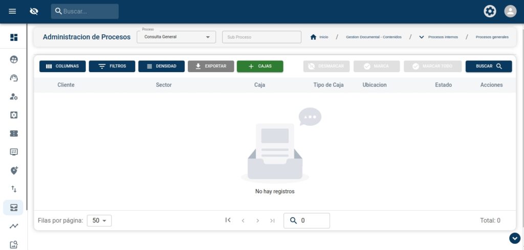 El papel fisico se almacena en cajas, y estas cajas se encuentran en estanterias con coordenadas para poder ser ubicadas, el sistema cuenta la parametria y validaciones necesarias para refleja la ubicación fisica de las cajas y sus contenidos de forma precisa – Asi como tambien permite realizar acciones sobre estas cajas, comoel retiro, la devolución o incluso mudenzas entre depositos.